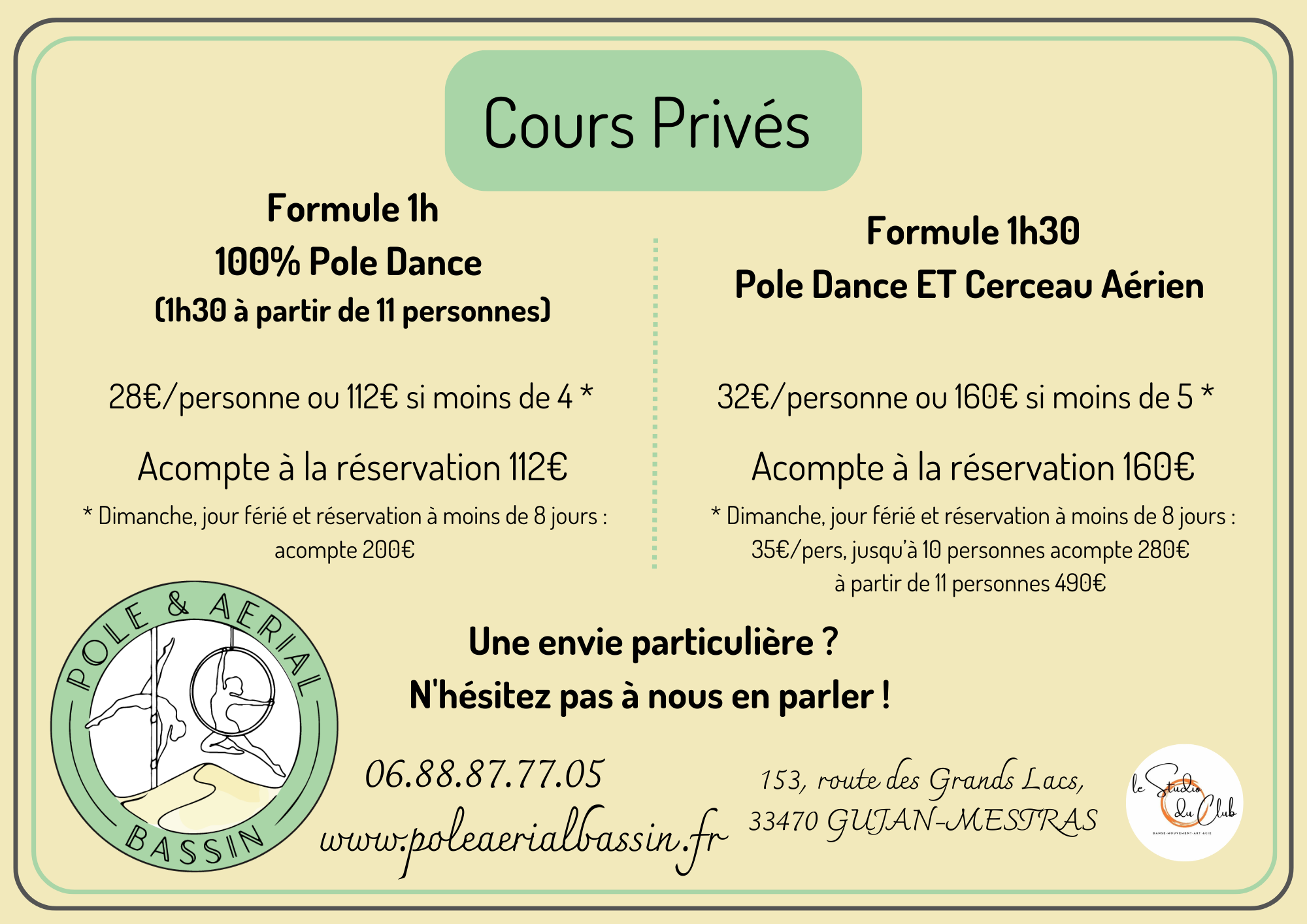 Vous souhaitez célébrer un évènement particulier ou progresser rapidement avec un coaching personnalisé ? Nous organisons vos cours privés sur demande pour créer un événement qui vous ressemble !